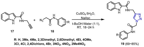 Recently, Sayahi et al. [25] reported the synthesis and characterization of N-phenylacetamide-1,2,3-triazole-indole-2-carboxamide derivatives (19) via the 1,3-dipolar cycloaddition of N-(prop-2-yn-1-yl)-1H-indole-2-carboxamide (17) with azide derivatives (18) in a water and t-BuOH mixture, using copper (I) as a catalyst at room temperature (Scheme 8). The resulting derivatives were obtained in satisfactory yields.