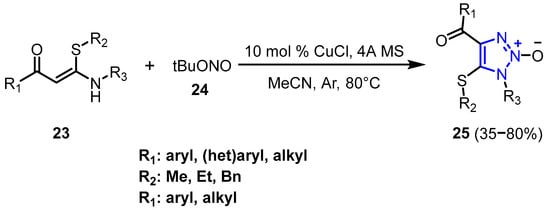 In 2023, Wu et al. [27] introduced a novel copper(I)-catalyzed nitrosylation/annulation cascade for enaminones (23), offering a direct route to 1H-1,2,3-triazole 2-oxides (25) using noncorrosive tert-butyl nitrite (TBN) (24) (Scheme 10). This method features readily available starting materials, a broad range of substrates, and excellent tolerance for various functional groups while eliminating the need for explosive azides.
