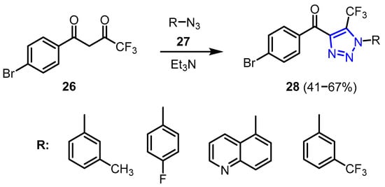 Recently, Stanitska et al. [28] reported the synthesis and characterization of new 1,2,3-triazole derivatives (28). The procedure involves the reaction of 1-(bromoaryl)-4,4,4-trifluorobutane-1,3-dione (26) with aryl-azide (27) in the presence of triethylamine at 70–75 °C for 5 h. The derivatives were isolated in high yields (Scheme 11).