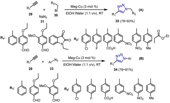 In 2024, Patel et al. [29] reported the synthesis and characterization of 1,2,3-triazole derivatives (32 and 34) using Meg-Cu as a catalyst. Their approach involved two methods: reacting alkynes (29) with in situ alkyl (30) and (azides 31) (A) and reacting alkynes (29) with aryl-azides (33) (B) in an ethanol and water mixture at room temperature. The derivatives were isolated in excellent yields (Scheme 12).