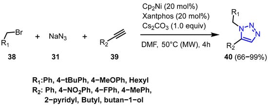 Camberlein et al. [31] described the microwave-assisted synthesis of 1,2,3-triazole derivatives (40). This compound was synthesized through a multicomponent reaction involving azides (31), bromides (38), and aryl and alkyl alkynes (39), yielding excellent results in terms of yield and regioselectivity (Scheme 14).