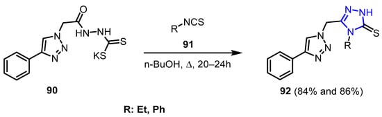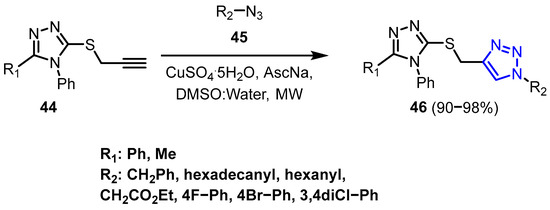 Al Sheikh Ali et al. [33] reported the synthesis and characterization of substituted 1,2,3-triazoles linked to 1,2,4-triazoles, beginning with the appropriate S-propargylated 1,2,4-triazoles (46). The formation of 1,2,4-triazole-linked 1,2,3-triazole cores was achieved through Cu(I)-catalyzed cycloaddition reaction between 1,2,4-triazole-based alkynes and various azides. This process was carried out by using microwave-assisted method, resulting in the desired 1,4-disubstituted 1,2,3-triazoles (Scheme 16).
