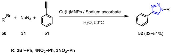 In their work, Rajabi-Moghaddam et al. [35] proposed a novel method for 1,2,3-triazoles (52) synthesis using Cu(II)-coated magnetic core-shell nanoparticles (Cu(II)MNPs), specifically superparamagnetic Fe3O4@SiO2, further modified by isotonic anhydride. The catalyst structure was characterized by using EDS, TGA, FESEM, VSM, XRD, and FT-IR analyses. Additionally, the magnetic properties of the catalyst facilitate its separation from the final product (Scheme 18).