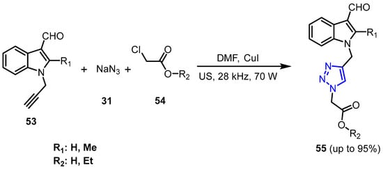 Mokariya et al. [36] reported the synthesis and characterization of a new 3-formyl-indole ring 1,2,3-triazole derivatives (55) using CuI as the catalyst with ultrasonic radiation. The procedure involves a condensation reaction between a 3-formyl-indole derivative (53), 2-chloroethyl acetate (54), and NaN3 (31) in DMF by using a powdered CuI catalyst and exposing the compounds to ultrasonic radiation at 28 kHz and 70 W. The final products were obtained with yields up to 95% (Scheme 19).