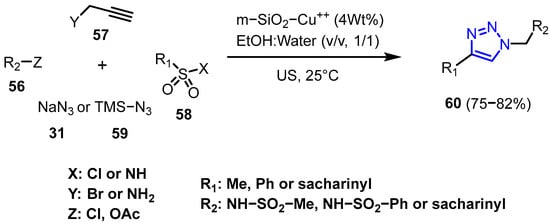 In another study, Talha et al. [37] reported the synthesis of novel sulfonamide-linked 1,2,3-triazoles through a multicomponent reaction using a Cu(II) catalyst supported on mesoporous silica under ultrasound irradiation and aqueous conditions. The catalyst demonstrated stability, selectivity, efficiency, and reusability. The resulting compounds were obtained in favorable yields (Scheme 20).