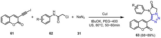 In 2023, Samala et al. [38] reported an easy and effective method for synthesizing 1,2,3-triazole derivatives (63) under ultrasound irradiation. The procedure involved [3+2] cycloaddition followed by a C-N bond formation reaction between 3-(iodoethynyl)-2H-chromen-2-one (61) and substituted 2-chloro-N-phenylacetamides (62). The resulting compounds were isolated in excellent yields (Scheme 21).