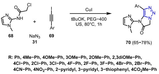 In another study, Johnpasha et al. [40] reported the synthesis of fused imidazole-imidazo[1,2-c][1,2,3]triazoles (70) using a PEG-400-mediated one-pot reaction under ultrasonic irradiation. The procedure involved reacting 2-chloro-N-(1-methyl-1H-imidazol-2-yl)acetamide (68), aryl iodoalkyne (69), NaN3 (31), and tBuOK as a base in the presence of CuI as a catalyst. The final products were recovered in favorable yields (Scheme 23).
