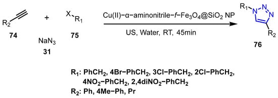 Recently, Aghajani et al. [42] reported the synthesis of a novel aminonitrile-functionalized Fe3O4 via the Strecker reaction. The aminonitrile ligand on the magnetic core’s surface coordinated with copper(II) to form the desired catalyst. This new catalyst was investigated in azide-alkyne Huisgen cycloaddition [3+2] reactions to synthesize 1,4-disubstituted 1,2,3-triazoles (76) in water as a green medium at room temperature. The process yielded products in excellent yields (Scheme 25).