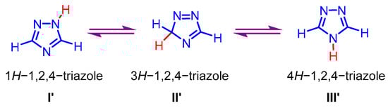 1,2,4-Triazole is an important heterocyclic motif commonly found in molecules with various bioactivities [43]. The 1,2,4-triazole molecule consists of three nitrogen atoms and two carbon atoms, all of which are sp2-hybridized. Unsubstituted 1,2,4-triazole exists in three distinct tautomeric forms (I’, II’, and III’) (Scheme 26). Theoretical and experimental calculations for 1,2,4-triazole indicate a preference for the 4H-1,2,4-triazole (III’) form [16]. This property enhances triazole’s versatility and complexity, significantly influencing various chemical reactions and processes. Inserting various valuable substituents at any of the three nitrogen atoms or the two carbon atoms of the 1,2,4-triazole skeleton plays a crucial role in enhancing its significance across various application fields. Key synthesis methods for 1,2,4-triazole derivatives involve using amidines, imidates, amidrazones, aryldiazoniums, and hydrazones as raw materials to provide the necessary nitrogen atoms.