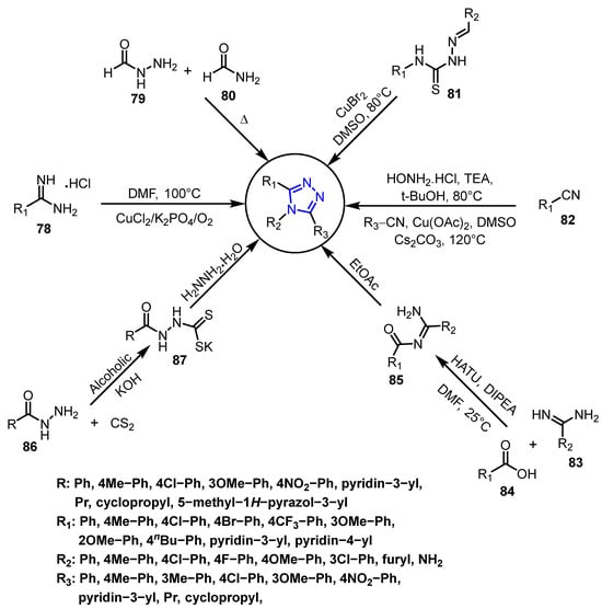 - Copper-catalyzed synthesis: A highly efficient catalytic system utilizing copper, K3PO4, and O2 has been utilized for the synthesis of 1,2,4-triazoles from amidines 78 and trialkylamines in DMF [44] (Scheme 27).