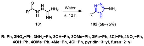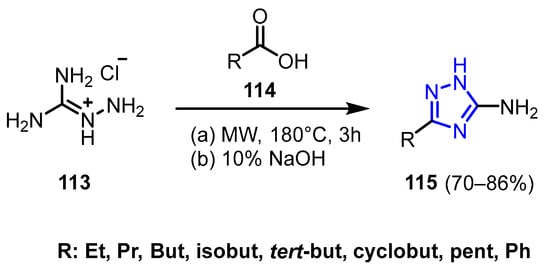 A novel series of 5-substituted 3-amino-1,2,4-triazoles (115) was synthesized through the direct condensation of carboxylic acids (114) with aminoguanidine hydrochloride (113) [59]. This method facilitated a general, eco-friendly, and straightforward synthesis of the target compounds, which included either aliphatic groups or a phenyl ring. The process was optimized by using sealed reaction vials under controlled microwave conditions, making it especially effective for volatile carboxylic acid substrates (Scheme 37).