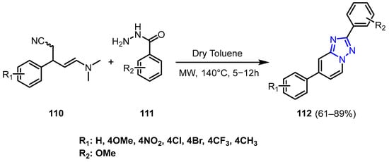 Lee et al. [58] have developed a catalyst-free, additive-free, and environmentally friendly method for synthesizing 1,2,4-triazolo[1,5-a]pyridines (112) using microwave irradiation. This tandem reaction employs enaminonitriles (110) and benzohydrazides (111), achieving the desired compound in a short reaction time. The methodology showcases excellent functional group tolerance, leading to products in good to excellent yields (Scheme 36).