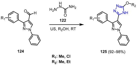 In their work, Titlin et al. [63] presented a green, ultrasound-assisted, one-pot method for synthesizing 1,2,4-triazole derivatives (125). The process involves combining an aldehyde (124), semicarbazide (122), and either methanol or ethanol and then applying ultrasonic activation to the mixture. This approach proved highly efficient, yielding new 1,2,4-triazole derivatives (125) with remarkable efficiency, achieving yields ranging from 92% to 98% (Scheme 41).