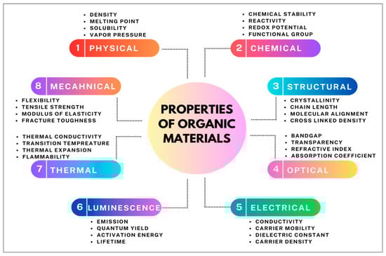 Carbon-based structures are important in organic materials, particularly in energy applications and flexible electronics. They have unique properties that allow for innovative design and functionality; they are essential to modern technology. Certain characteristics set the organic materials used in semiconductor devices apart from traditional inorganic semiconductors, and because organic semiconductors are composed of molecules based on carbon, a wide variety of structural configurations are possible. Owing to their adaptability, electronic characteristics can be customized for certain uses []. It is simpler to design a range of organic electronic devices because organic materials may be doped to create N- and P-type semiconductors that function similarly to their inorganic counterparts. Charge-transfer organic conductors demonstrate remarkably high electrical conductivities, which are influenced by their molecular arrangements and phase transitions [,]. These materials exhibit electrical anisotropy, which may be used in cutting-edge electronic applications to improve the efficiency of devices such as organic field-effect transistors. Combining organic materials with inorganic elements, such as hybrid organic–inorganic perovskites, enhances the stability and efficiency of optoelectronic devices, thereby addressing the common limitations of organic semiconductors []. Figure 1 provides an overview of the unique properties of organic materials relevant to their use in optoelectronics and electronic applications. It highlights physical, chemical, structural, mechanical, optical, electrical, thermal, and photoluminescence characteristics, such as density, chemical stability, molecular alignment, flexibility, absorption coefficient, conductivity, thermal properties, and emission behavior.