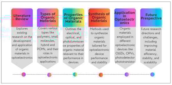The goal of this study was to provide a comprehensive overview of the most recent advancements in the synthesis, properties, and applications of organic materials in the optoelectronics sector. The process flow outlined in this evaluation is illustrated in Figure 3. In addition to discussing the challenges related to stability, scalability, and performance, this review will focus on the unique benefits that organic materials possess over traditional inorganic materials, such as their light weight, simple processing, and flexibility. With an emphasis on the critical role of organic materials in the development of state-of-the-art optoelectronic devices such as organic solar cells, organic thin-film transistors, and OLEDs, this study seeks to provide an overview of the current research conditions. Possible future paths to improve the stability and functionality of these devices in real-world applications are also discussed. This research was motivated by the rapidly growing field of organic optoelectronics, which has attracted significant attention owing to the potential and versatility of organic materials in modern technology. This review seeks to bridge the knowledge gap by offering a comprehensive analysis of the techniques utilized to create organic materials, their integration into optoelectronic devices, and the potential for their use in the future for large-scale, sustainable applications in industries such as flexible electronics, energy harvesting, and wearable technology.