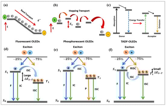Figure 5. Diagrammatic depictions of (a) charge transport resembling ballistic bands and (b) charge transport via hopping mechanism. (c) The mechanism of Förster resonance energy transfer (FRET), operational principles of (d) fluorescence, (e) phosphorescence, and (f) thermally activated delayed fluorescence.