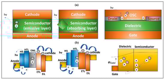 Figure 9. (a) Schematics, (b) energy band diagrams, and working mechanism of OLEDs [].