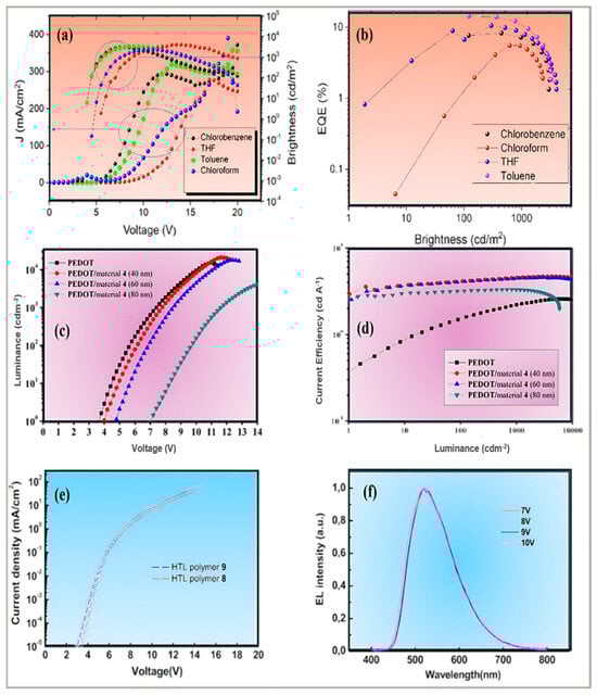 Organic light-emitting diodes (OLEDs) provide substantial advantages over standard LEDs based on inorganic semiconductors. Organic light-emitting diodes (OLEDs) are a revolutionary technology that creates light through organic chemicals, developed from Tang and Van Slyke’s groundbreaking research in 1987 []. OLEDs have attracted considerable attention because of their remarkable use as eco-friendly light sources and full-color display screens. Under an external voltage, OLEDs, which are electroluminescent devices, can emit light within an organic emissive layer. Their benefits include the potential to reduce manufacturing costs, light weight, versatility for a range of applications, and ability to be produced on a variety of substrates using solution-based techniques. Furthermore, OLEDs are very appealing to academia and industry because of their low driving voltage, quick reaction, and simple preparation []. OLEDs are ideal for both consumer electronics and lighting applications because they harness the light emission characteristics of organic materials to create high-quality displays with exceptional color purity and energy economy [,].