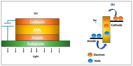 OLEDs usually have a multilayered construction that is intended to maintain the electron and hole recombination sites contained in the emissive layer of the device. In general, the device consists of the following components: a transparent conductive glass substrate with a high work function, transparent anode, electron and hole transport layer (ETL and HTL), electron and hole injection layer (EIL and HIL), emission layer (EML), and cathode (Figure 9a) []. The stacking of the organic layers improves device performance, the injection layers help to prolong the lifespan of the device, and the transport layers reduce power consumption and increase efficiency []. OLEDs produce mobile electrons and holes when a voltage is applied, causing an electrical current to flow across them. The emissive layer receives electrons from the cathode and the EML (Figure 9b) becomes exciton-paired because of the holes injected from the anode [].