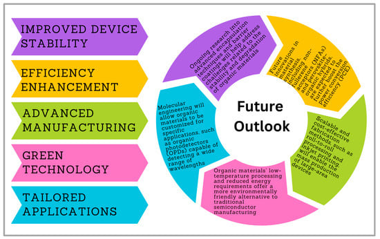 Organic semiconductors are ideal for use in conformal devices, such as flexible screens, wearable electronics, and other devices that require little weight and flexibility. Roll-to-roll manufacturing techniques, for example, are appropriate for manufacturing organic thin-film transistors (OTFTs) on flexible substrates such as polyethylene terephthalate (PET) and poly(imide) []. The stiffness of conventional silicon-based electronics, which are sometimes heavy and fragile, contrasts sharply with this flexibility. Compared with silicon-based technologies, organic compounds also provide better processability. Solution-based methods, which are often easier and less expensive to process than high-temperature and high-vacuum procedures required for silicon, can be used to handle them. This covers procedures such as printing, spin-coating, and other solution-based deposition processes [,]. Organic electronics are even more ecologically friendly when non-toxic and safe solvents are used. In general, the fabrication of organic electronics is less expensive than that of silicon equivalents. Overall, a reduction in production costs is facilitated by the use of affordable, flexible substrates and low-temperature processing []. New developments in the synthesis and design of organic semiconductors have resulted in materials with high charge-carrier mobilities that are on par with or even higher than those of amorphous silicon [].