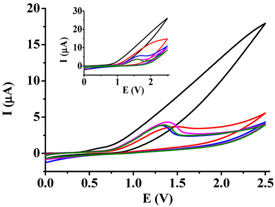 Subsequent voltammetric curves for 2′,6′-dihydroxyacetophenone in acetic acid (main graph) and ethyl acetate (inset graph) (scan rate 0.1 V/s, supporting electrolyte 50 mM TBAP, black curve: 1st, red curve: 2nd, blue curve: 3rd, green curve: 4th, magenta curve: 5th voltammogram).