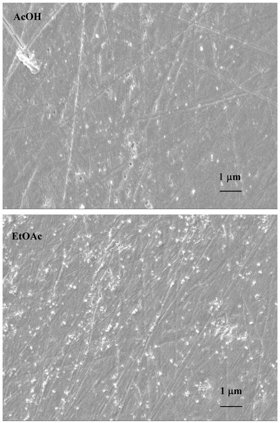 The related scanning electron micrographs, shown in Figure 5, depict the deposits formed from resorcinol. In high-permittivity acetonitrile, a coherent coating developed, providing valuable insights into the effects of the two investigated solvents. When acetonitrile was mixed with the solvents, thinner films were produced, and the polymeric products predominantly aggregated into particles. The size and quantity of these particles were greater in the pure low-permittivity solvents, as fewer products were formed, preventing the development of a thick coating. Additionally, the enhanced rupture of the polymer from the platinum surface facilitated stronger binding between polymer segments.