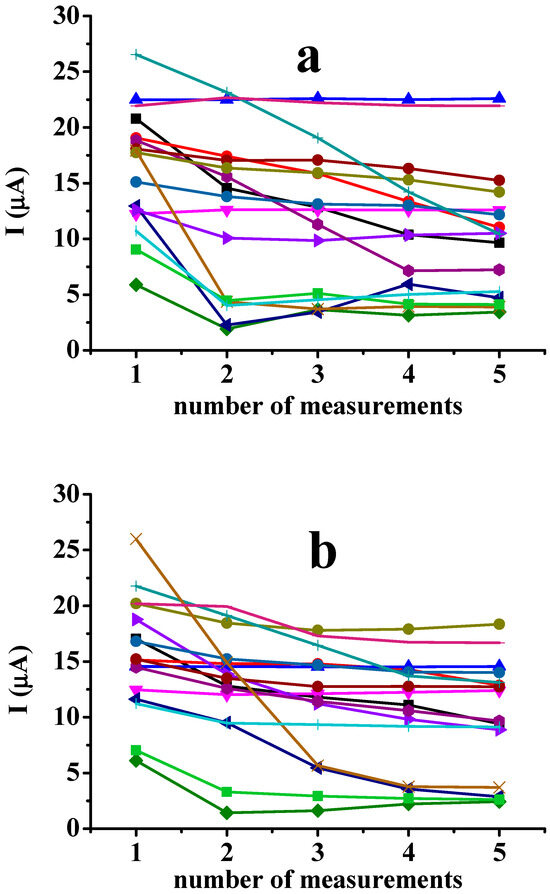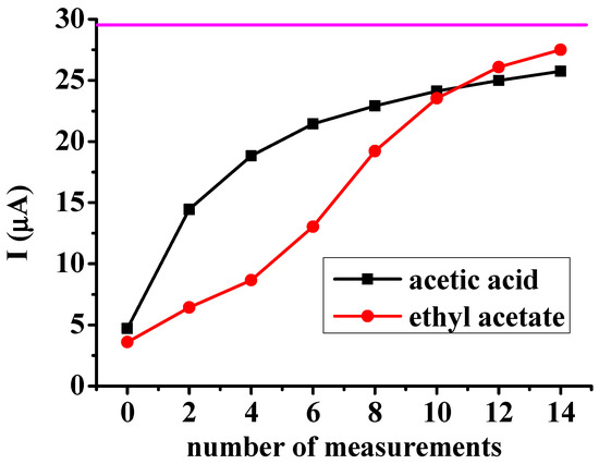 Under the same conditions, ten voltammograms were performed in both solvents, using a solution of 5 mM butylhydroxytoluene in acetonitrile to monitor changes in layer permeability over time. Peak current readings were taken every two minutes from the start of the immersion of the blocking layer into the measurement solution, as shown in Figure 7. The horizontal magenta line represents the peak current measured with a bare electrode in the butylhydroxytoluene solution.
