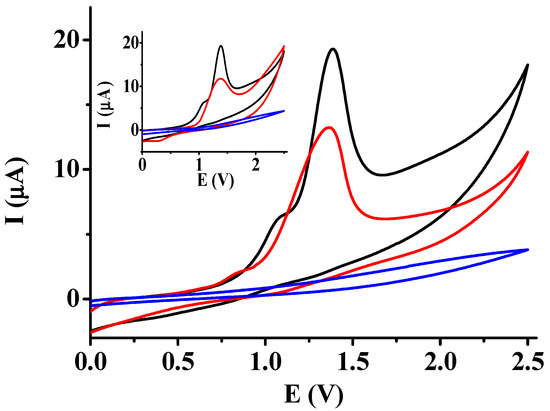 Cyclic voltammograms of 5 mM resorcinol taken in acetonitrile (black curve), in its mixtures with the corresponding 80 v/v% low-permittivity solvent (red curve) and in the pure low-permittivity solvent (blue curve) (the inset graph is related to ethyl acetate, v = 0.1 V/s, supporting electrolyte: 20 mM TBAP).