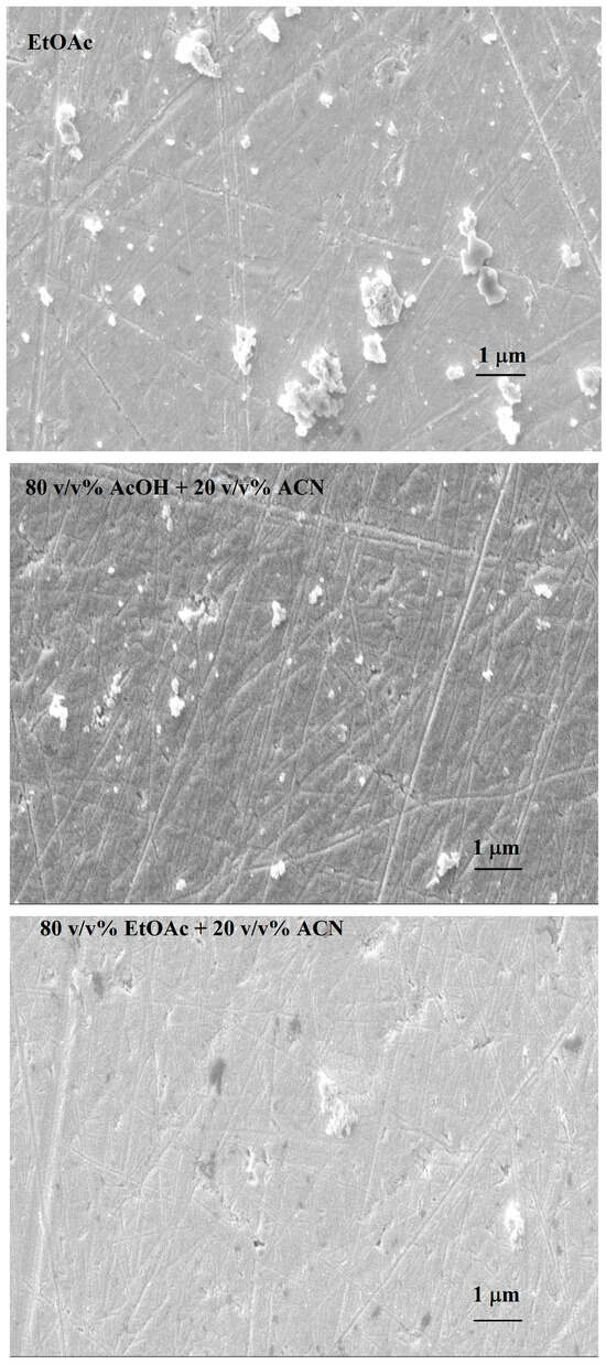 Scanning electron micrographs of electropolymerized 2′,6′-dihydroxyacetophenone in acetic acid (AcOH) and ethyl acetate (EtOAc).