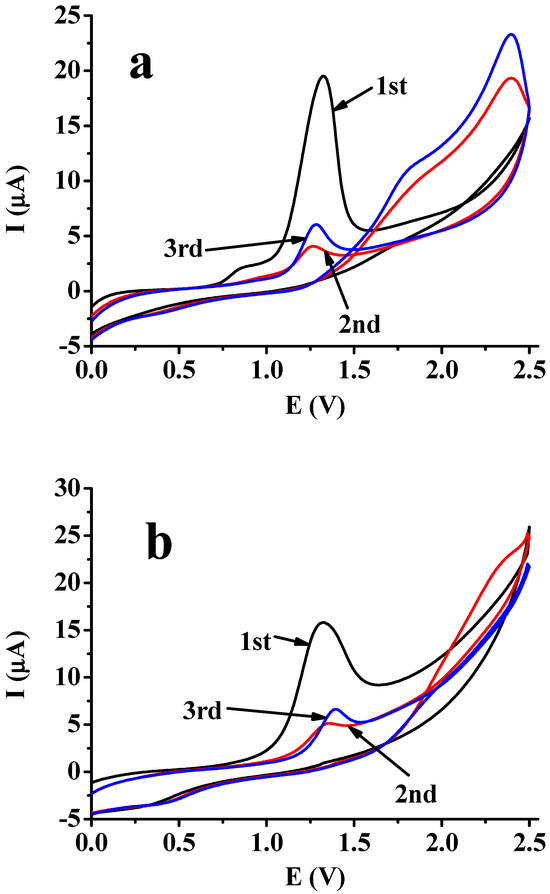 Comparing the areas of the voltammetric peaks reveals significant differences. In the solvent mixture with acetonitrile, the smaller peak with a lower area is reasonable, considering that the viscosity of glacial acetic acid is much higher than that of acetonitrile. The amount of polymer formed in the studied low-permittivity solvents is drastically reduced, as previously discussed regarding the monomers’ behavior. This explains why, in most cases, no peaks appeared in the first voltammogram.