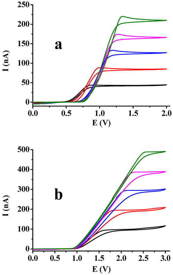 Steady-state voltammetric curves taken with 25 mm platinum microdisc electrode in acetic acid (a) and ethyl acetate (b) (4-methoxyphenol concentrations: 5 mM (black), 10 mM (red), 15 mM (blue), 20 mM (pink), 25 mM (green); scan rate 0.1 V/s, supporting electrolyte 50 mM TBAP).