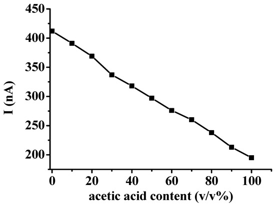 The key variables considered included the onset potential of the plateaus and the plateau currents. However, during the measurements, these values exhibited monotonic changes only at low acetic acid contents. Consequently, the plateau currents were selected as the calibration parameter. These values, plotted in Figure 9, show that the plateau currents changed approximately linearly with the viscosity of the solvent mixture.