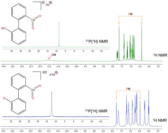 1H NMR and 31P{1H} NMR spectra (DMSO-d6, 300 K) of Na[OH-Ph-Ph-PHO2] and Na2[O-Ph-Ph-PHO2]. Further selected NMR spectra are reported in the Supporting Materials, Figures S2–S5.