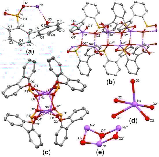 Crystals of Na[OH-Ph-Ph-PHO2] suitable for X-ray diffraction were obtained from the slow diffusion of acetone in ethanol solutions. The asymmetric unit (Figure 2) contains a monodeprotonated [2-(2-hydroxyphenyl)phenyl]phosphinic acid and a sodium cation. The proton lost is that of the phosphinic moiety, while the phenolic one remains in the compound. The metal cation is situated at only 2.2771(10) Å from one of the {PHO2} oxygen atoms and at 2.3354(11) Å from the phenolic oxygen atom. Other three oxygen atoms from neighbouring [2-(2-hydroxyphenyl)phenyl]phosphinate anions, two of them belonging to a phosphinate group and one to a phenolic moiety, are near the sodium cation, with Na-O distances between 2.2891(10) and 2.6618(11) Å (Table 1). The cation results as five-coordinated (Figure 2), with an environment best defined as a highly distorted square pyramid [73]. The output of Continuous Shape Measures calculations [74], carried out with the SHAPE version 2.1 software, is provided in Table S2. The classical τ5 descriptor for 5-coordination [75] gives a value of (β − α)/60 = (150.09−126.33)/60 = 0.40, closer to that expected for a square pyramidal geometry (τ5 equal to 0.0) with respect to a trigonal bipyramid (τ5 equal to 1.0) [76].