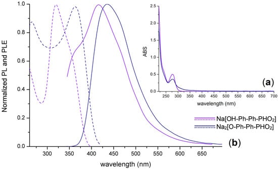 (a) Absorption spectra of 2 × 10−4 M water solutions of Na[OH-Ph-Ph-PHO2] and Na2[O-Ph-Ph-PHO2]. (b) Normalized PL (solid lines, λexcitation = 320 nm) and PLE (dashed lines, λemission = 530 nm) spectra of solid samples of Na[OH-Ph-Ph-PHO2] and Na2[O-Ph-Ph-PHO2] at r.t.