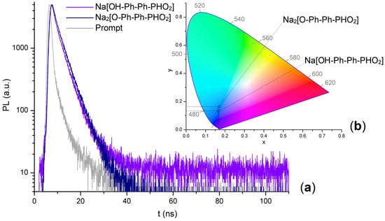 (a) Luminescence decay curves of Na[OH-Ph-Ph-PHO2] (violet) and Na2[O-Ph-Ph-PHO2] (blue). Solid samples, r.t., λexcitation = 373 nm, λemission = 410 nm. (b) CIE 1931 cromaticity diagram: Na[OH-Ph-Ph-PHO2], x = 0.165, y = 0.135; Na2[O-Ph-Ph-PHO2], x = 0.169, y = 0.164.