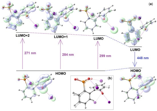 The geometry optimization of free Na2[O-Ph-Ph-PHO2] was carried out using the hybrid meta-GGA DFT (density functional theory) functional TPSS0, with 25% HF exchange [60], in combination with Ahlrichs’ def2-TZVP basis set [61]. The C-PCM implicit solvation model was added, considering ethanol as continuous medium [62]. The “restricted” approach was used. The stationary point was characterized as a true minimum by means of IR simulation, carried out with the harmonic approximation [63]. The C-PCM/TPSS0/def2-TVZP method was also applied for the TDDFT (time-dependant DFT) simulations of the electronic transitions, carried out considering 12 singlet and 12 triplet roots and with the inclusion of spin–orbit correction [64]. Calculations were carried out using ORCA version 5.0.3 [65,66]. The Cartesian coordinates of the DFT-optimized geometries are collected in the Supplementary Materials in xyz format.