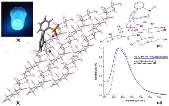 (a) Picture of a Na2[O-Ph-Ph-PHO2]@cellulose sample under 254 nm UV irradiation. (b) DFT-optimized geometry of Na2[O-Ph-Ph-PHO2]@cellulose. Colour map: Na, violet; P, orange; O, red; C, grey; H, white. (c) Detail of the interactions between Na2[O-Ph-Ph-PHO2] and cellulose with Na-O bond lengths in Å. (d) Normalized PL spectra of Na2[O-Ph-Ph-PHO2]@cellulose (solid line) and Na2[O-Ph-Ph-PHO2] (dashed lines). Solid samples, λexcitation = 320 nm, r.t.