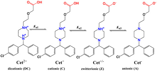 Chemically, cetirizine is an amholyte with three ionizable centers, one acidic (carboxyl group) and two basic (piperazine nitrogens) (Figure 1). Its ionization profile includes a complex system of protolityic equilibria that establish in solution, containing four equilibrium forms, dicationic (Cet2+), monocationic (Cet+), zwitterionic (Cet+/−) and anionic (Cet−) (Figure 1). Resolving this complex system of protolytic equilibria could be a particular challenge, taking into account that the pKa values are close and the ionization processes overlap. In this case, the strategy that offers the possibility of a precise pKa determination is potentiometry combined with the evaluation of the experimental data in the Hyperquad program [28].