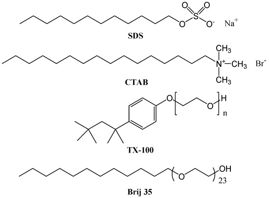 The membrane-mimicking approach is based on the philosophy of compartmentalization of molecules in systems which may affect reaction rates, properties and stereochemistry that, in turn, differ from those observed in “pure” aqueous solutions [14,15]. There is no ideal model that fully reproduces all the complexities of biomembranes [16], but a large variety of simplified membrane mimetic systems are available [17,18,19]. Since their properties are well understood at the chemical level, micellar solutions of differently charged surfactants are the most commonly used systems to mimic the desired functions of cells membranes [14,20]. In our previous studies, we showed that protolytic equilibria (acid–base equilibria) of ionizable drugs may significantly shift in micellar solutions [21,22,23,24,25]. Our results suggest that is not possible to predict the direction and intensity of the shift, which requires comprehensive experimental consideration of every single compound. Drug compounds containing two or more ionizable centers represent the greatest challenge, especially when the pKa values are near to each other and the ionization processes overlap [12]. Assessing the biopharmaceutical profile of these drugs by applying pKa values exclusively defined in “pure” water can be misleading, as possible interactions with biomolecules may significantly change the assumed ionization patterns. In these terms, this study aimed to investigate the protolytic equilibria of cetirizine in solutions of differently charged micelle-forming surfactants: cationic, cetyltrimethylammonium bromide, (CTAB); anionic, sodium dodecyl sulfate (SDS); nonionic, 4-octylphenol polyethoxylate (TX-100); and polyoxyethylene lauryl ether (Brij 35). The chemical structures of the surfactants are presented in Figure 2.