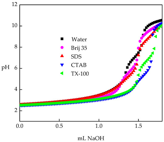 Cetirizine solution potentiometric curves with and without the presence of 10−2 M surfactant (SDS, CTAB, TX-100 and Brij 35) titrated with standard NaOH solution. I = 0.1 M (NaCl) and t = 25 °C.