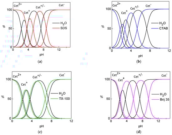 Cetirizine equilibrium forms’ distribution in “pure” water and in the differently charged micelles supplied solutions, (a) SDS, (b) CTAB, (c) TX-100 and (d) Brij 35, as a function of pH.