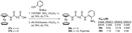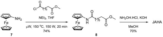 - Spencer, J.; Amin, J.; Wang, M.; Packham, G.; Alwi, S.S.S.; Tizzard, G.J.; Coles, S.J.; Paranal, R.M.; Bradner, J.E.; Heightman, T.D. Synthesis and Biological Evaluation of JAHAs: Ferrocene-Based Histone Deacetylase Inhibitors. ACS Med. Chem. Lett. 2011, 2, 358–362. [Google Scholar] [CrossRef] [PubMed]