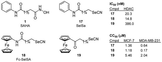 - Librizzi, M.; Longo, A.; Chiarelli, R.; Amin, J.; Spencer, J.; Luparello, C. Cytotoxic Effects of Jay Amin Hydroxamic Acid (JAHA), a Ferrocene-Based Class I Histone Deacetylase Inhibitor, on Triple-Negative MDA-MB231 Breast Cancer Cells. Chem. Res. Toxicol. 2012, 25, 2608–2616. [Google Scholar] [CrossRef] [PubMed]