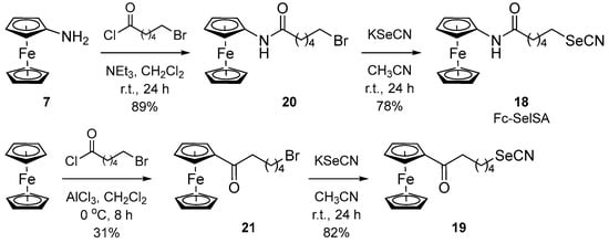 - Cázares-Marinero, J.D.J.; Top, S.; Jaouen, G. Synthesis and Characterization of New Ferrocenyl Compounds with Different Alkyl Chain Lengths and Functional Groups to Target Breast Cancer Cells. J. Organomet. Chem. 2014, 751, 610–619. [Google Scholar] [CrossRef]