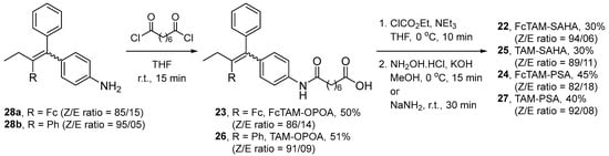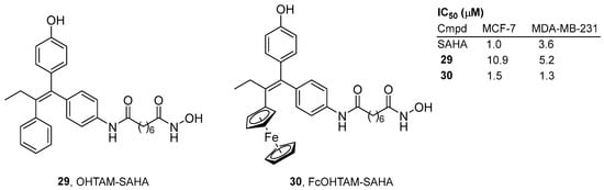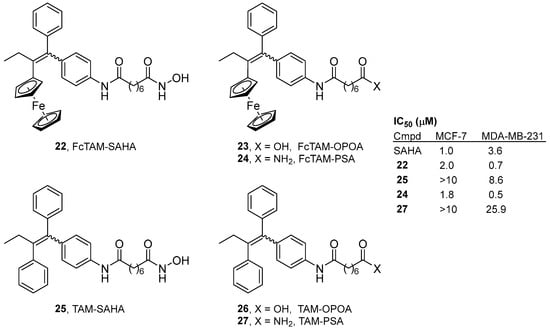 - Cázares Marinero, J.D.J.; Lapierre, M.; Cavaillès, V.; Saint-Fort, R.; Vessières, A.; Top, S.; Jaouen, G. Efficient New Constructs against Triple Negative Breast Cancer Cells: Synthesis and Preliminary Biological Study of Ferrocifen–SAHA Hybrids and Related Species. Dalton Trans. 2013, 42, 15489. [Google Scholar] [CrossRef]