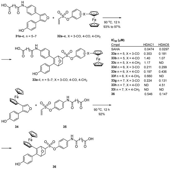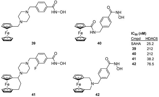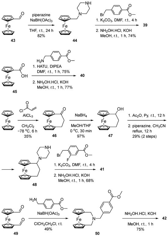 - Yan, J.; Yue, K.; Fan, X.; Xu, X.; Wang, J.; Qin, M.; Zhang, Q.; Hou, X.; Li, X.; Wang, Y. Synthesis and Bioactivity Evaluation of Ferrocene-Based Hydroxamic Acids as Selective Histone Deacetylase 6 Inhibitors. Eur. J. Med. Chem. 2023, 246, 115004. [Google Scholar] [CrossRef]