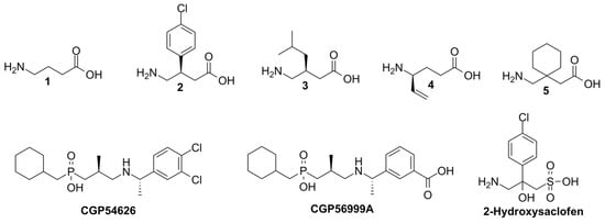 Chemical structure of GABA (1), Baclofen (2), Pregabalin (3), Vigabatrin (4), Gabapentin (5), CGP54626, CGP56999A, and 2-hydroxysaclofen.