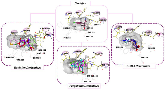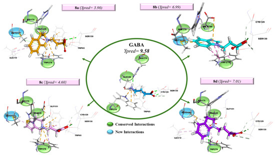 For Glu349, the interaction was retained; however, there was no energetic contribution to the overall interaction energy. In the case of His170, a small improvement in terms of interaction energies was obtained; however, better interaction energies were obtained with respect to GABA, as well as a change in the interactions performed, which change from an H-bond typical of GABA to Van der Waals interactions in the case of molecules 8a, 8b and 8d, and to a Pi–sulfur interaction for 8c.