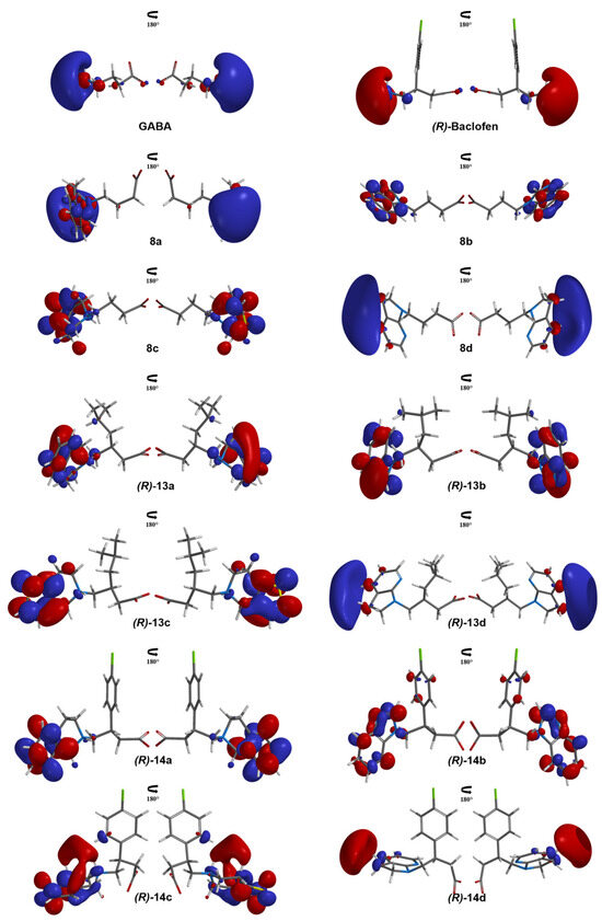 For this similarity analysis, the LUMO graphics of our best candidates, in (R)-enantiomer, according to the QSAR and the (R)-Baclofen and GABA, were obtained; the LUMO graphics of the (S)-enantiomer are shown in Figure S57. Additionally, molecular electrostatic potential (MEP) mapped onto an iso-density surface (0.002 e−/Å3) for each candidate was obtained and compared to determine the electronic zones with higher and lower electronic density [47]. In MEP graphics, regions with higher electronic density are in red, and those with less density are in blue [30]. Moreover, to evaluate the force of the binding regions where intermolecular interactions with GABAB receptor will take place, molecular electrostatic potential surfaces of iso-values (±320 kJ/mol) were obtained. All the molecular graphics were performed in Spartan’24.